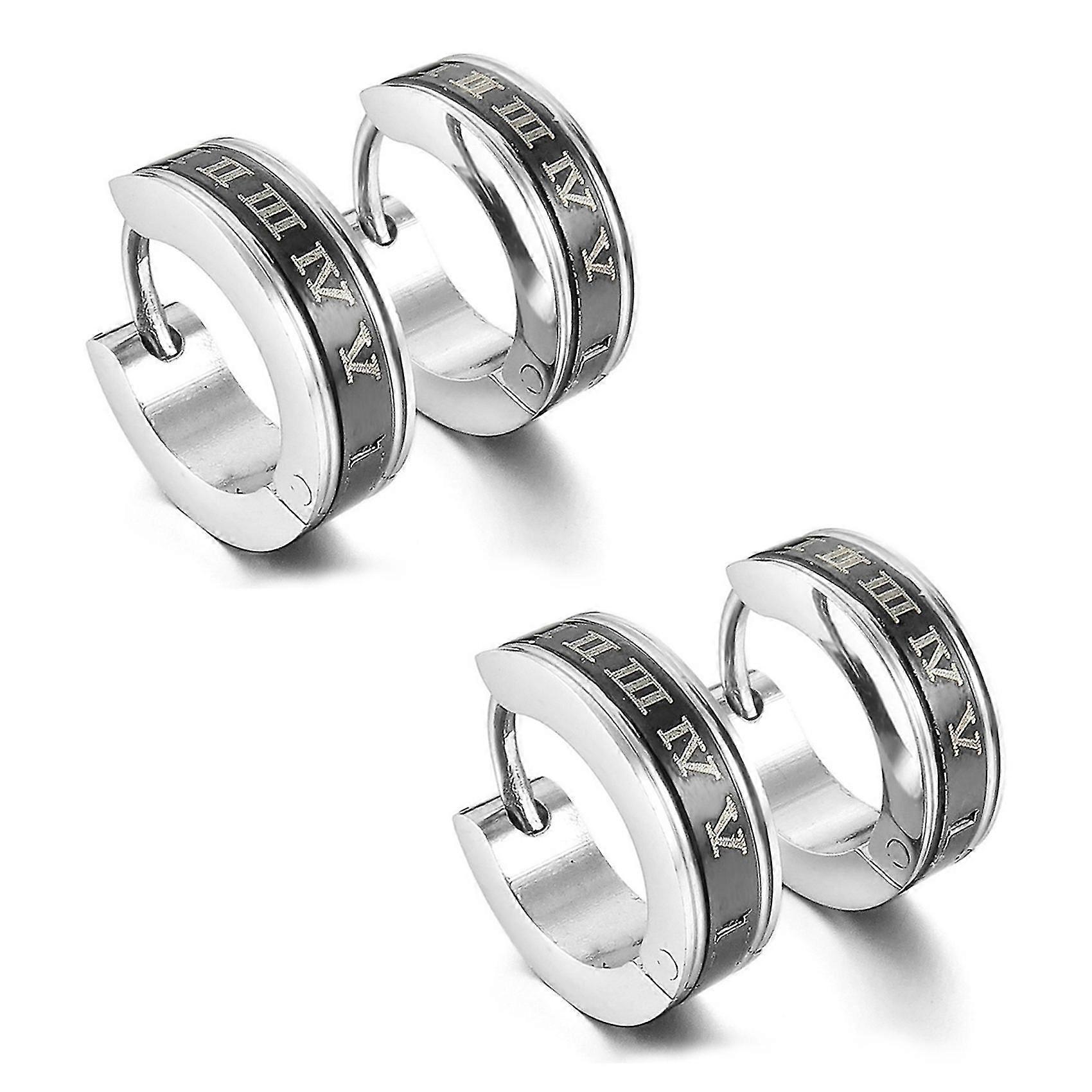 4x Stainless Steel Stud Plugs Hoop Earrings Ear Studs Black Silver Color Roman Numerals Classic Pol