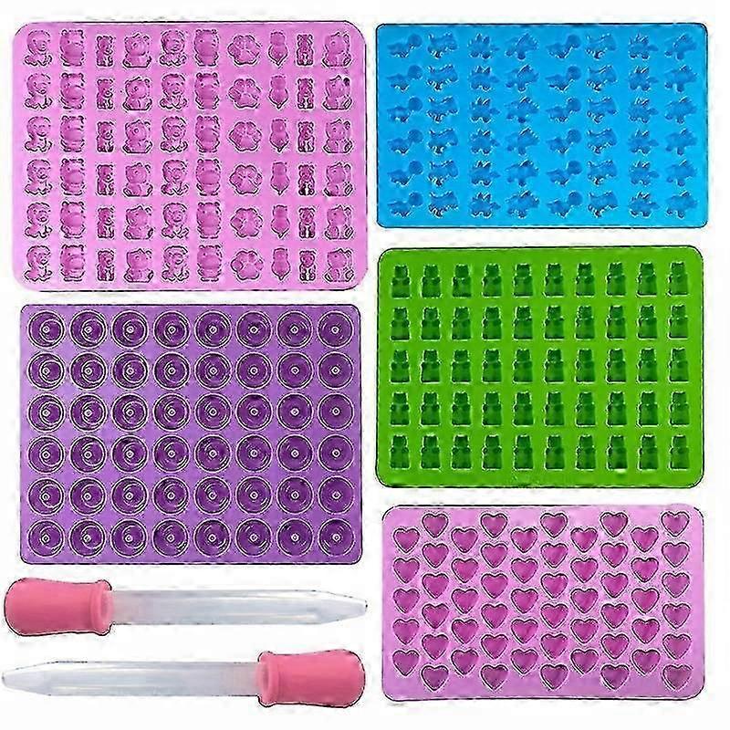 Versatile: Perfect for making gummy bears, chocolates, candies, and more Easy to Use: Non-stick silicone material ensures easy release and cleaning Complete Set: Comes with 5 molds and 2 droppers, everything you need for DIY candy making Safe Material: Made of food-grade silicone, BPA-free and non-toxic