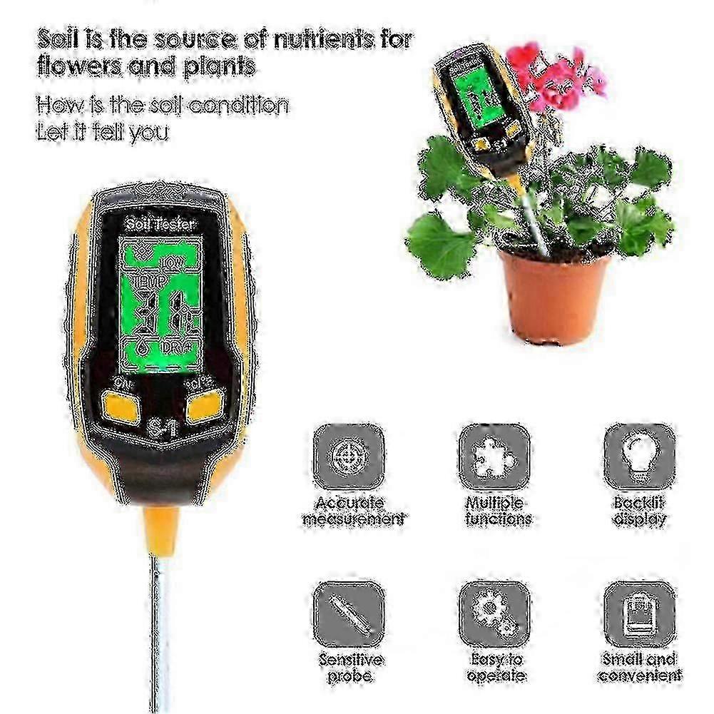 5 in 1 Flower Pot Soil Tester PH Detector Moisture or Light or PH or Temperature Specifications: Name: 4 in 1 soil tester (moisture or light or PH or temperature) Product size: about display screen 95x57x27mm or 3.74x2.24x1.06in, full length 317mm or 12.48in, probe 205mm or 8.07in Operating temperature: and5-and40 Power battery: AAA15V batteries Measure the light intensity of the current environment: LOW- LOW LOW and NOR- NOR NOR and HGH- HGH HGH and Measures soil moisture. Measure soil temperature, temperature measurement range: -9and50(16122F), accuracy 1 or 1F. Measure soil pH, pH value range: 3.5-9.0. Measure soil moisture, percentage of TEM content. How to use this soil tester Step 1: Install the batteries, turn on the tester and select PH or C on the back. Step 2: Insert the probe into the soil about 3-5 inches. Step 3: Adjust the position of the probe until the tester is fixed in the ground for the test. Step 4: Read the humidity or pH or light or temperature test values on the display screen. Choose the pH or on the back according to your needs. Step 5: Remove the probe from the ground and wipe it clean after each use. Packing list: Soil testerx1 (without batteries) Manual x 1