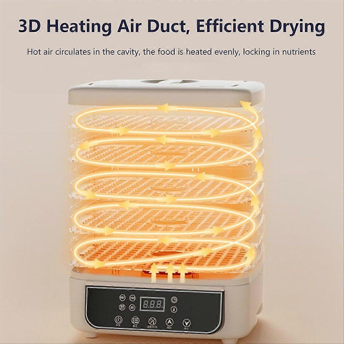 User-Friendly Touchscreen: This food dehydrator features a responsive touchscreen and LED display for precise temperature and time settings. Efficient Multi-Layer Drying: With a five-tray capacity, this food dehydrator can simultaneously dry a variety of foods, from fruits and vegetables to meats. This not only maximizes efficiency but also helps save valuable kitchen time, making it ideal for meal prep and batch cooking. Preserves Natural Flavor and Texture: An ideal choice for cooking enthusiasts and health-conscious individuals, this dehydrator preserves the natural flavor and texture of food. Whether you're making jerky, fruit snacks, or homemade candies, enjoy high-quality, nutritious treats every time. 360 Airflow for Uniform Drying: Advanced 360 airflow technology delivers a consistent and even drying experience. This feature ensures even heating across each tray, eliminating the need to rotate trays and ensuring even drying of all layers. Easy to Clean and Energy-Efficient: This dehydrator's convenient design, removable mesh trays, and automatic timer make operation effortless and convenient. Its simple cleaning and energy-saving design allow for hands-free food storage, making it perfect for busy . Plug Type:EU Plug,it applies to Indonesia, Germany, France, Spain, Italy and so on. Voltage: AC220V Color: As Shown Material: plastic Package Contents: 1 * Food Dehydrator Machine Only the above package content, other products are not included. Note: Light reflection and different displays may cause the color of the item in the picture a little different from the real thing. The measurement allowed error is +/- 1-3cm.