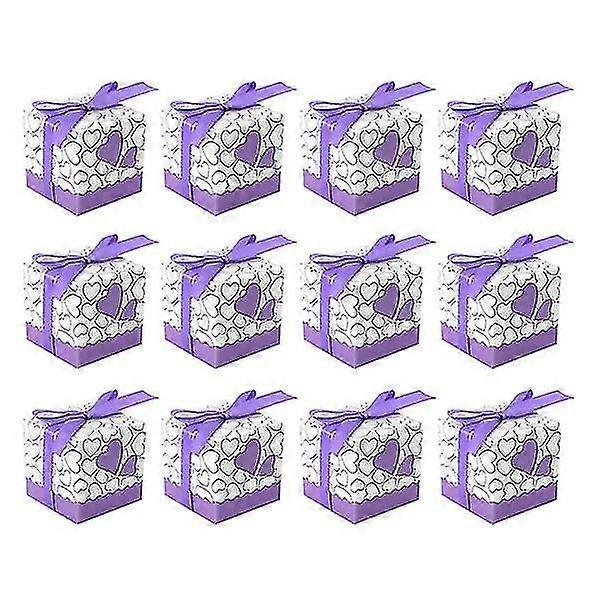50pcs Hearts Design Candy Boxes - Square Chocolate Gift Containers with Ribbon (Purple)