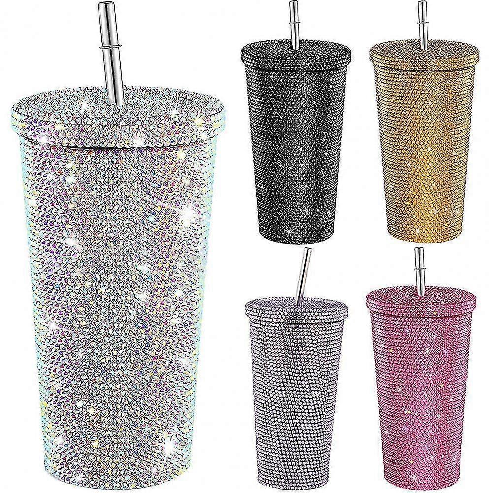 500ml Straw Cup With Lid Reusable Rhinestone Stainless Steel Double Layer Thermos Cups Women Glitter Cup Water Bottle Gift 2023