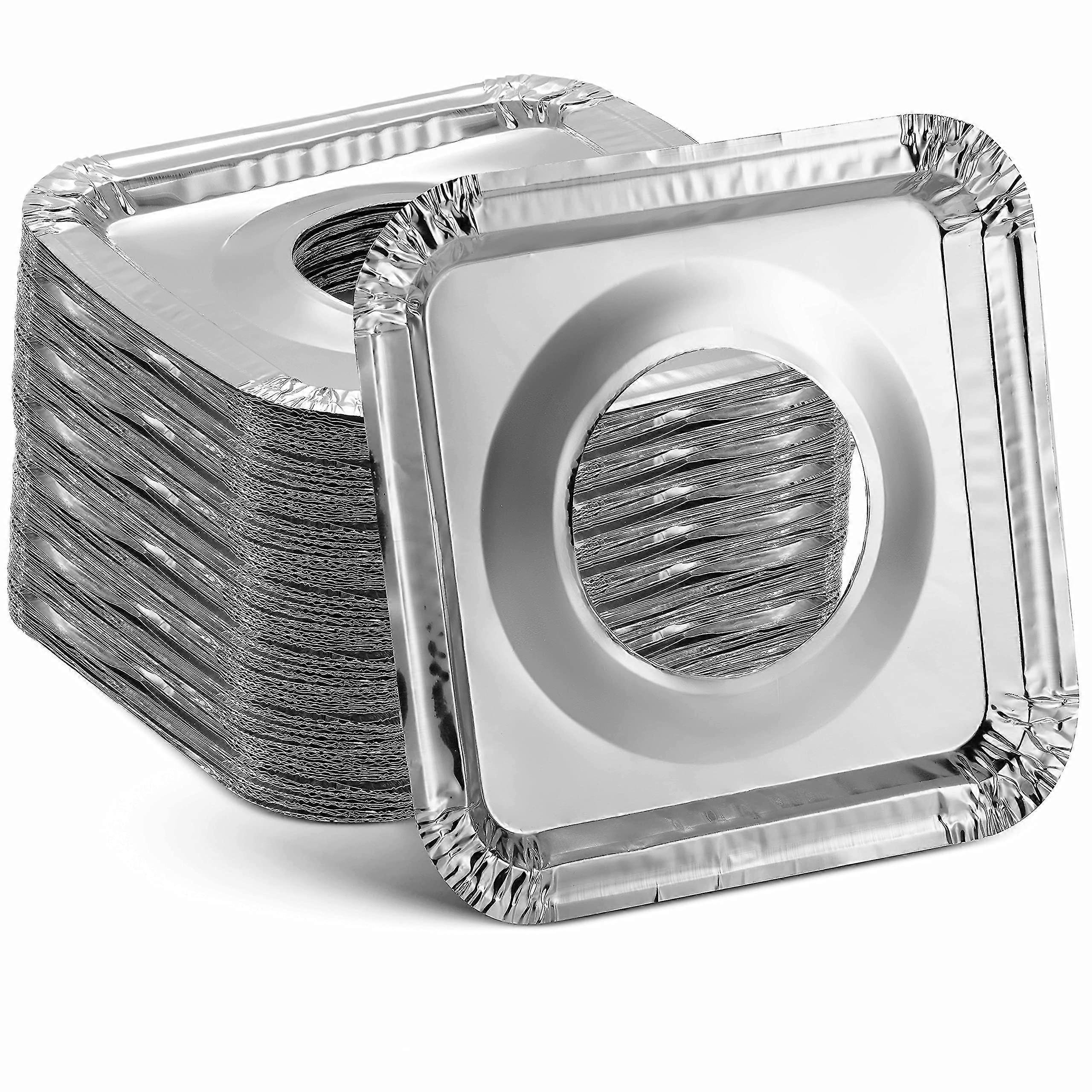 KEEP YOUR STOVETOP CLEANER THAN NEW Our versatile gas stove liners give you freedom to cook all day, every day, without worrying about messy spills, stains, scratches, scorches, food residue, and other common wear. Simply place a disposable protector on each burner to avoid the endless scrubbing, and keep your cooktop in perfect condition. DURABLY CONSTRUCTED TO BEAT THE HEAT Heavy-duty aluminum foil material offers lightweight convenience, exceptional durability, and reliable heat conductivity, making it perfect for high-traffic appliances in homes, restaurant kitchens, catering facilities, food trucks, and more. Our silver covers also blend seamlessly with stainless steel surfaces. STANDARD SIZING THATS WILLING TO FLEX Our square stovetop covers measure 8 on each side and 3 at the center opening, which is compatible with most of todays popular residential and commercial stoves. Flexible foil may be custom adapted to fit separate and continuous grates, while integrated grooves help catch grease and oil. NEAT AND CLEAN AND SWEET TO EARTH were super conscious of the impact of our single-use and disposable products. Rest assuredthese bib liners are 100% recyclable and built to last for multiple mealtime preparations. Stay true to your green beliefs while preserving your appliances and ensuring utmost food safety and hygiene. BUY BULK VALUE FOR SIZZLING SAVINGS Stock up on your essential foodservice supplies with our handy pack of 100 stovetop splatter guards. Whether youre running a business or simplifying your home cleaning schedule, these affordable odorless covers bring ultimate peace of mind. Skip the noxious sprays and cleanersand start lining today
