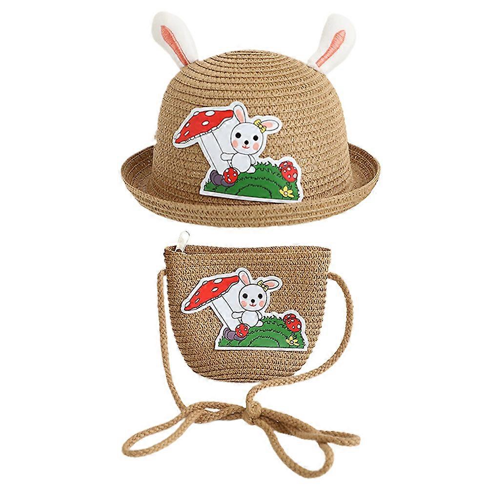 52-54cm hat circumference children's summer straw hat rabbit ears cute cartoon sunscreen sun hat beach foldable hat and straw bag set