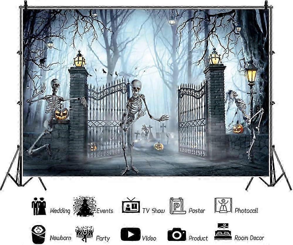 5x3ft Vinyl Halloween Photography Backdrop Funny Skeleton Play with Pumpkin Background Halloween Photo Backdrop Horror Cemetery Gate