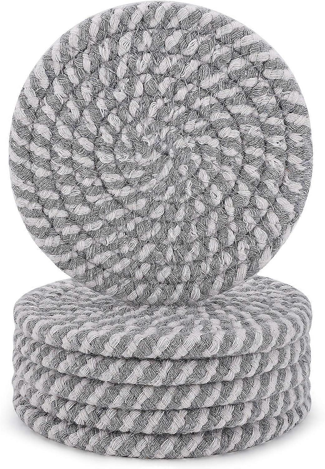 6Pcs Coasters for Drinks ,Stylish Handmade Braided Woven Drink Coasters (4.3inch), 100% Cotton Super Absorbent Heat-Resistant Round Coasters, Great Ho