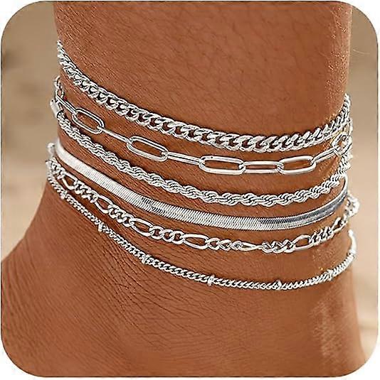 6 PCS Gold Ankle Bracelets for Women, 14k Plated Gold Layered Anklet Set Waterproof Herringbone Paperclip Beaded Figaro