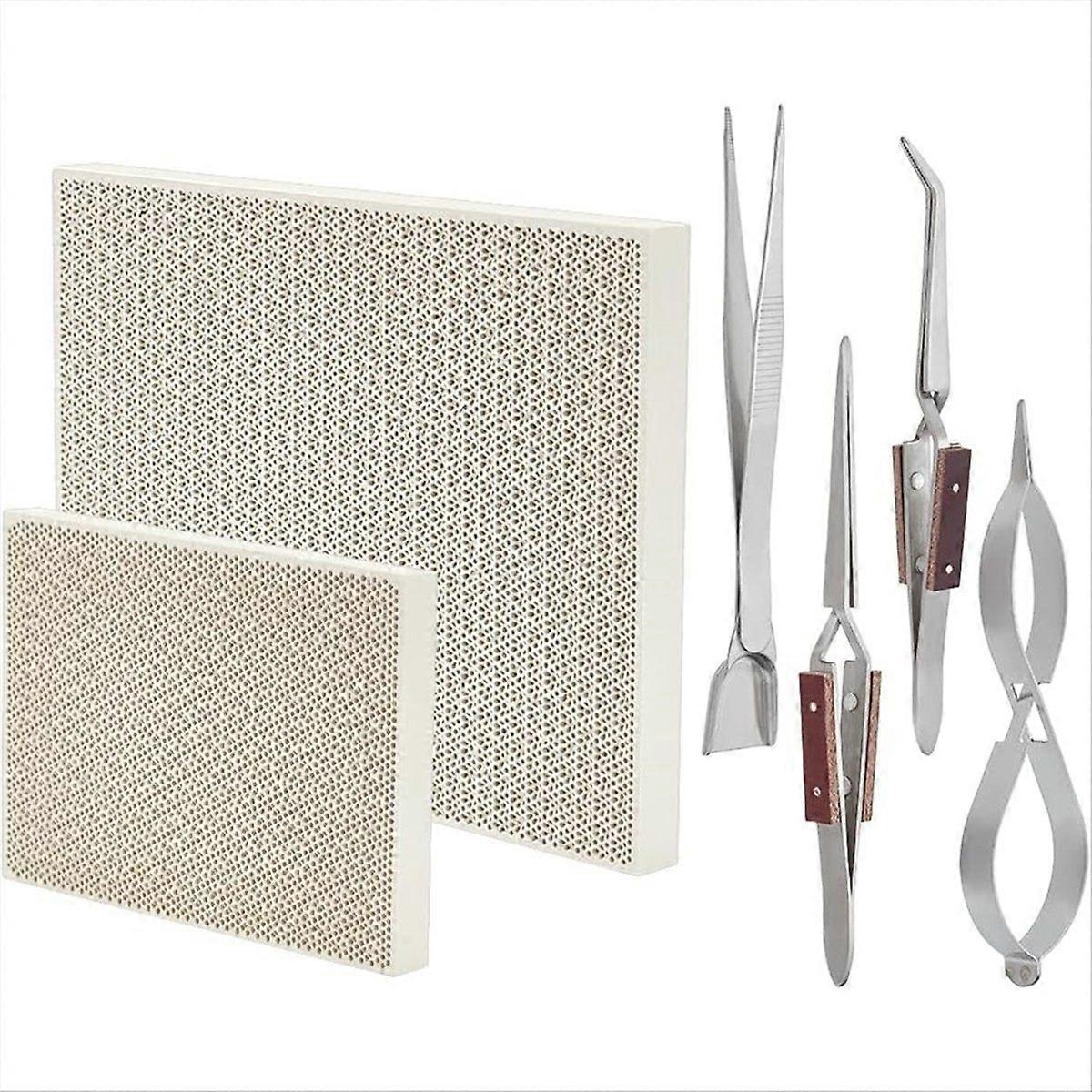 You receive 6 pcs jewelry soldering kit, including 2 pcs honeycomb quartz soldering plates, 3 pcs soldering plates and 1 pc 304 stainless steel tweezers with spatula, make sure you 't be short of essential tools halfway through your work. Honeycomb ceramic soldering plate measures about 13.3x9.25x1.33cm/19.9x14.2x1.35cm, stainless steel soldering pliers measure about 15.3x1.6x1.3cm/15.9x1.75x0.95cm/13.4x3x1.15cm, and 304 stainless steel tweezers with spatula measure about 16x2.35 x1.9cm. Honeycomb welding plate is mainly made of quartz, which can withstand high temperature up to 1450 degree Celsius, tweezers are mainly made of 304 stainless steel, which is not easy to rust, and can long-term use. These soldering tweezers feature a reverse design, the innovative reverse design makes it easy to hold the item; they only release when you open them; in addition, the wooden elements on the handles prevent your hand from hot, so you can hold them comfortably. Our soldering plates for jewelry making can be widely used in jewelry making, and can also be used as an auxiliary tool for jewelry repair, metal soldering, etc, ideal for your tool collection. Color: As Shown Material: Metal Package Contents: 1 set x Jewelry Soldering Kit Only the above package content, other products are not included. Note: Light reflection and different displays may cause the color of the item in the picture a little different from the real thing. The measurement allowed error is +/- 1-3cm.