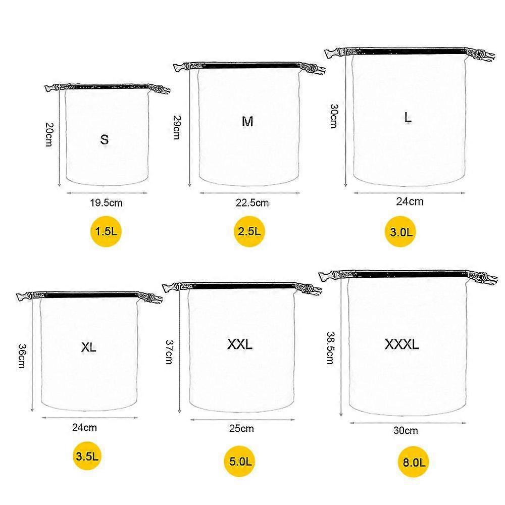 Feature:1. Made of 190T polyester taffeta with PU coating,durable and waterproof.2. Provides good conservation from water, sand, dirt, dust, mud and snow.3. Roll the top down 3-5 times and then close the buckle.4. It can be rolled or folded to save space when not in use.5. Different sizes for your different use.6. Come with a storage bag for easy storage and carry.7. Perfect for diving,skating,kayaking,boating,sailing,surfing,fishing,rafting,hiking,swimming and camping etc.Specification:Features:Made of 190T polyester taffeta with PU coating,durable and waterproof.Provides good conservation from water, sand, dirt, dust, mud and snow.Roll the top down 3-5 times and then close the buckle.It can be rolled or folded to save space when not in use. Different sizes for your different use.Come with a storage bag for easy storage and carry.Perfect for diving,skating,kayaking,boating,sailing,surfing,fishing,rafting,hiking,swimming and camping etc.Specifications:Color: Black/Army Green/Light Blue (optional)Material: 190T polyester taffetaS size: (1.5L)19.5*20cm/7.7*7.9inM size: (2.5L)22.5*29cm/8.9*11.4inL size: (3.0L)24*30cm/9.4*11.8inXL size: (3.5L)24*36cm/9.4*14.2inXXL size: (5.0L)25*37cm/9.8*14.6inXXXL size: (8.0L)30*38.5cm/11.8*15.2inWeight: Approx. 190g/6.7ozPackage List:1* Bag(S)1* Bag(M)1* Bag(L)1* Bag(XL)1* Bag(XXL)1* Bag(XXXL)Package List:1* Bag(S)1* Bag(M)1* Bag(L)1* Bag(XL)1* Bag(XXL)1* Bag(XXXL)