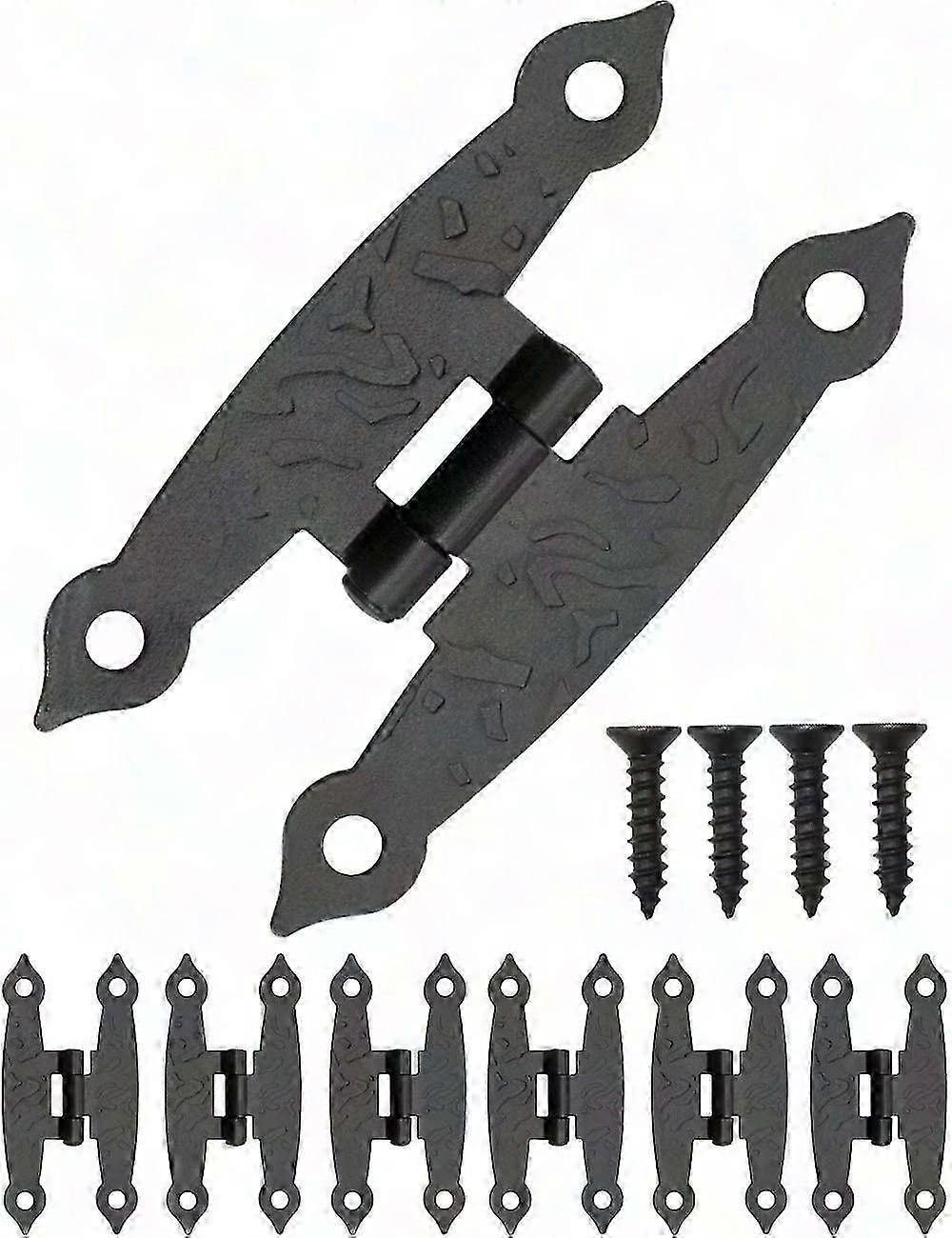 Set of 6 hinges in a weathered iron design, country house style, retro look, lacquered black.For cabinets, chests, dresser doors, kitchens, for the restoration of antique furniture.Weathered Iron Appearance The aged appearance is unmistakable.Matching wood screws included, also in weathered look.Dimensions 65 x 33 mm;Contents: Set of 6 hinges 24 wood screws included.