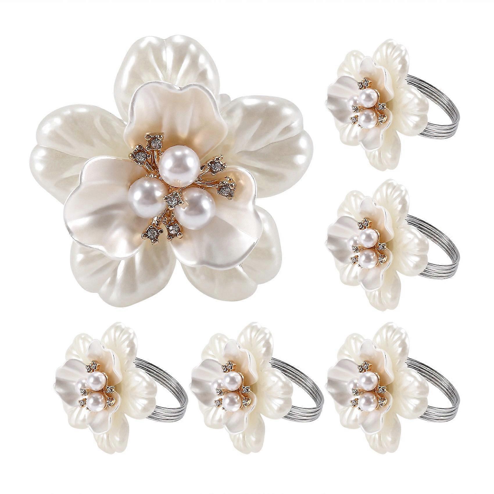White Pearl Flower Napkin Rings Set Of 6, Crystal Diamond Napkin Rings For Wedding Birthday Party Ho