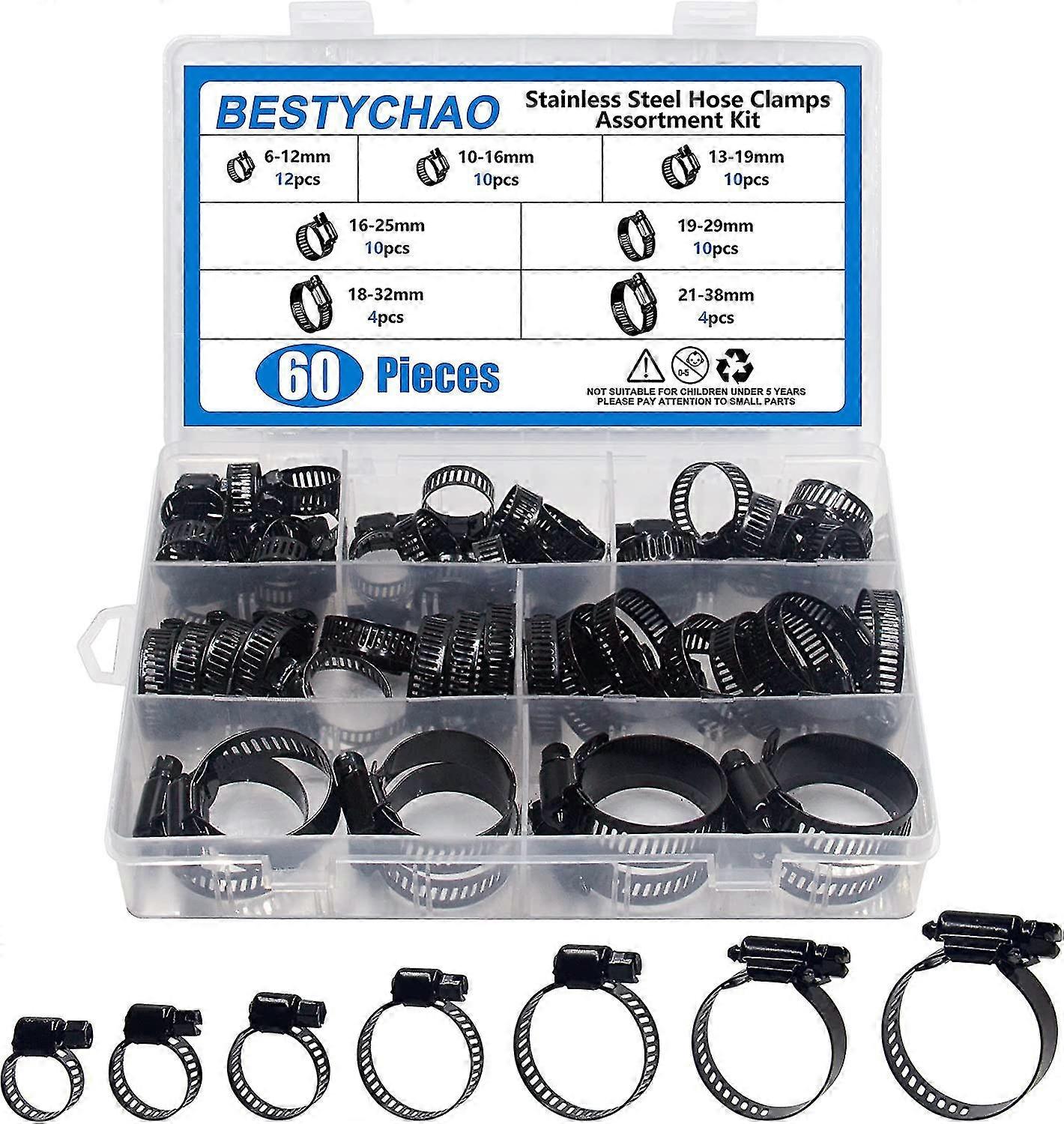 60 Piece Worm Gear Hose Clips Assortment Stainless Steel With Adjustable Range 6-38mm (black)