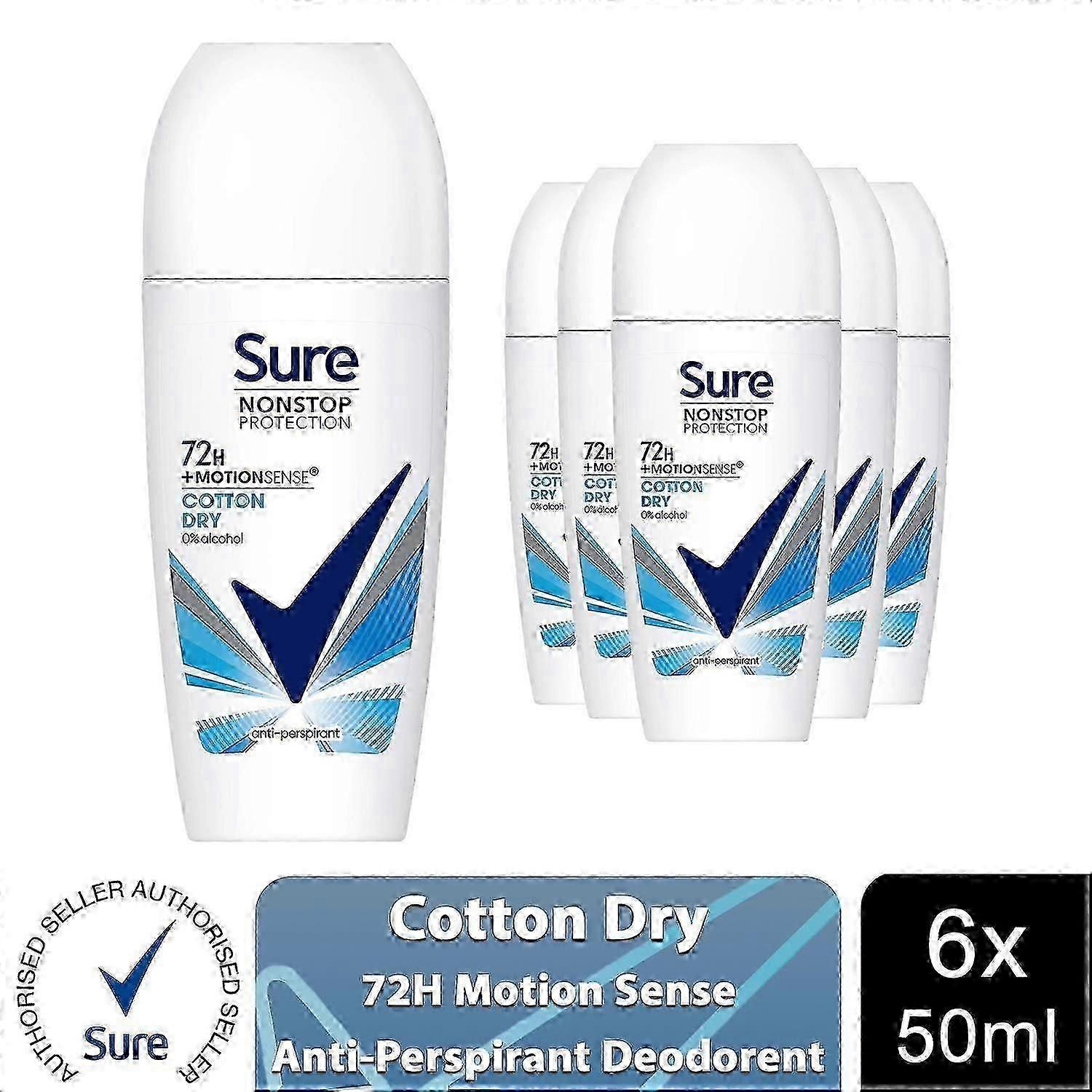 6x Sure Women Motion Sense AP Deodorant Roll-on 72H Nonstop, Cotton Dry, 50ml