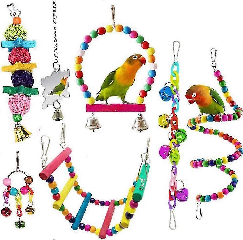 7 Pcs Bird Parrot Toys, Hanging Bell Pet Bird Cage Hammock Swing Climbing Ladders Toy Wooden Perch Mirror Chewing Toy