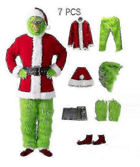 7pcs The Grinch Costume Christmas Cosplay Adult Santa Costume Outfits Set + Mask--Uki