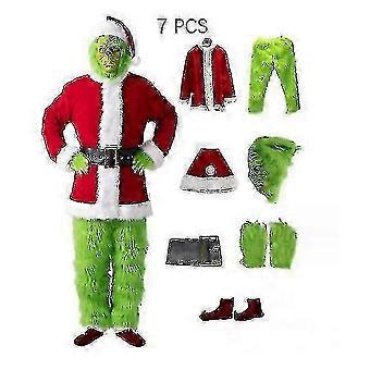 7pcs The Grinch Costume Christmas Cosplay Adult Santa Costume Outfits Set + Mask - J