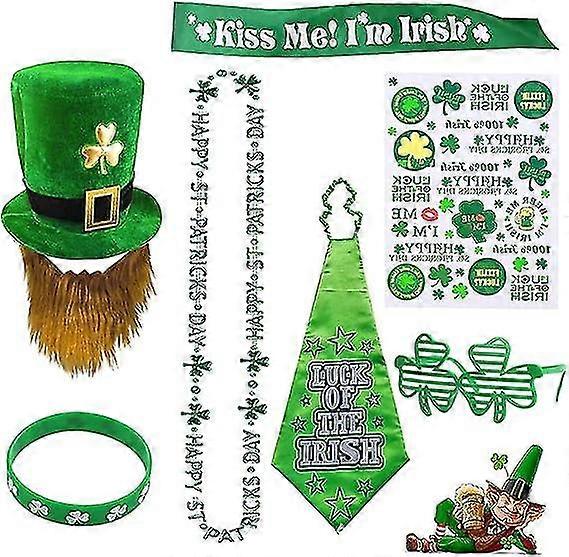 7pcs St Patrick's Day Costume Set, Shamrock Top Hat, Necklace, Neck Tie, Lucky Wristband, Clover Glasses, Sticker For Leprechaun Party Supplies