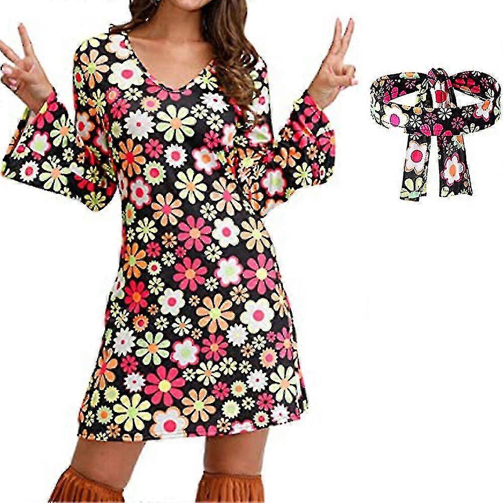 70s 80s Hip Hop Costume Set Women Disco Hippie Dress Headband Halloween Cosplay Outfit