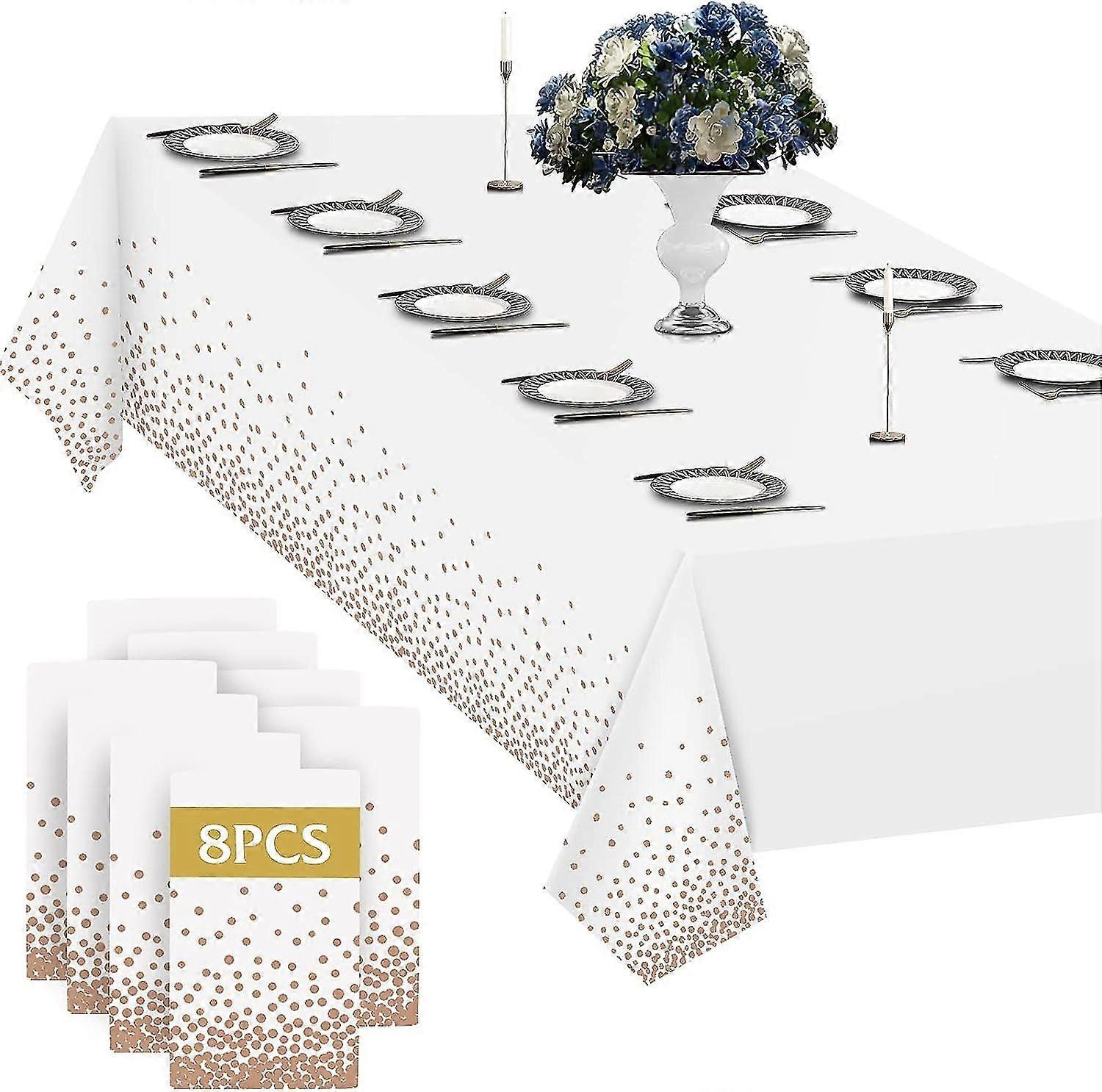 8 Pack Plastic Table Cloth Cover For Parties Disposable, White And Gold Tablecloth For 8 Foot Rectangle Tables, Birthday Wedding Graduation Mather Val