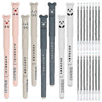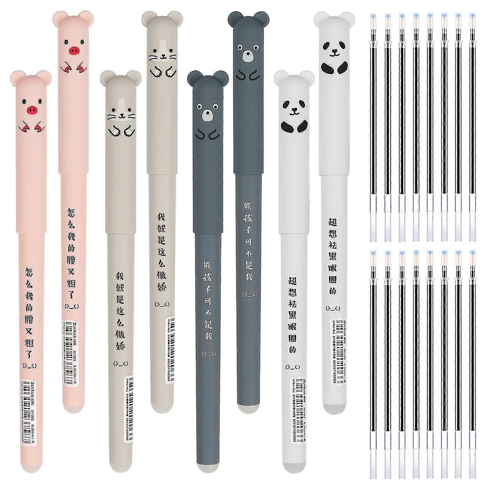 8pcs Rollerball Erasable Pens, Cartoon Animal Pens Erasable Black Ink Gel Pens With 16pcs Erasable