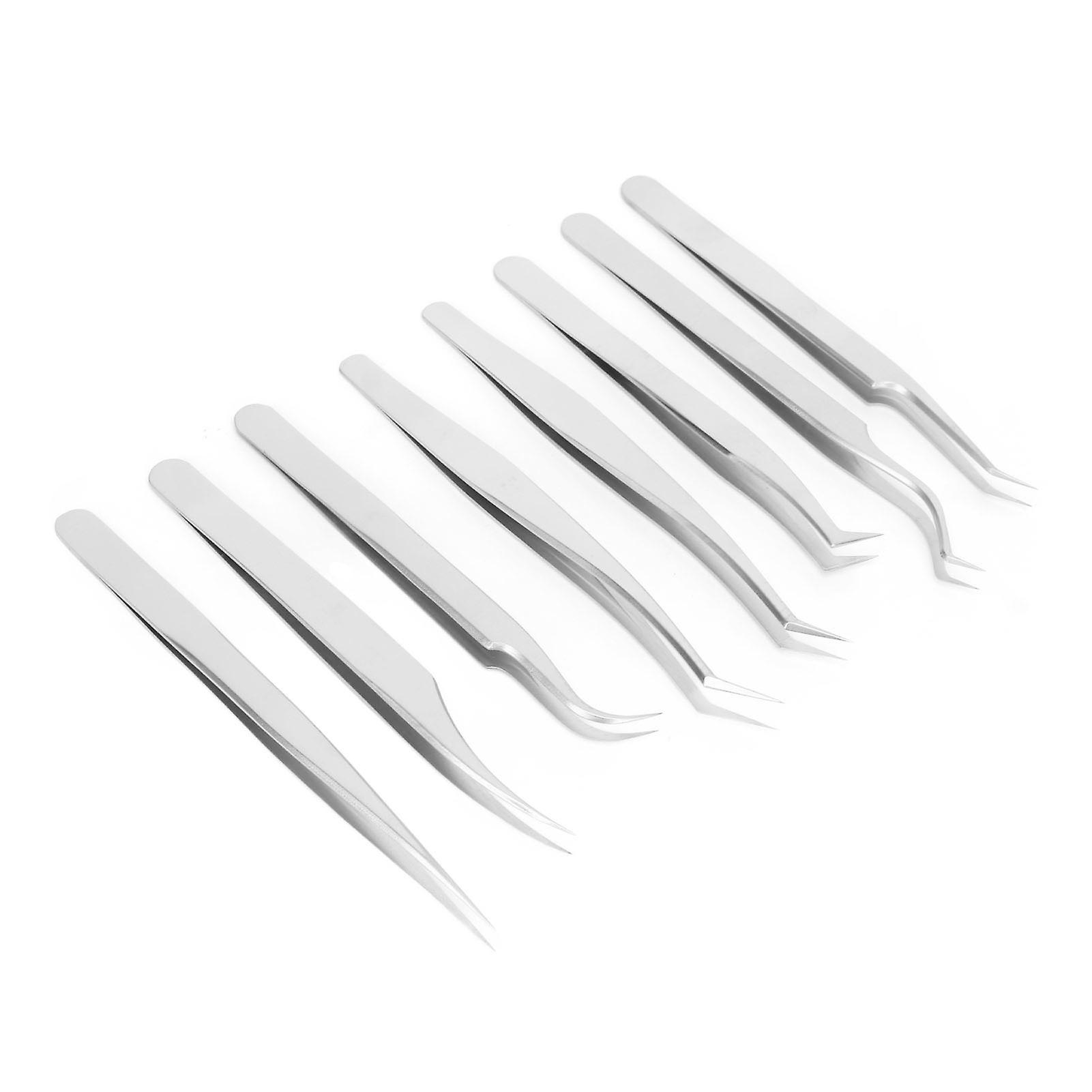 8pcs Eyelash Tweezers Stainless Steel Fine Tip Ergonomic Design One Piece Molding Silvery Eyelash Extension Tweezers Set