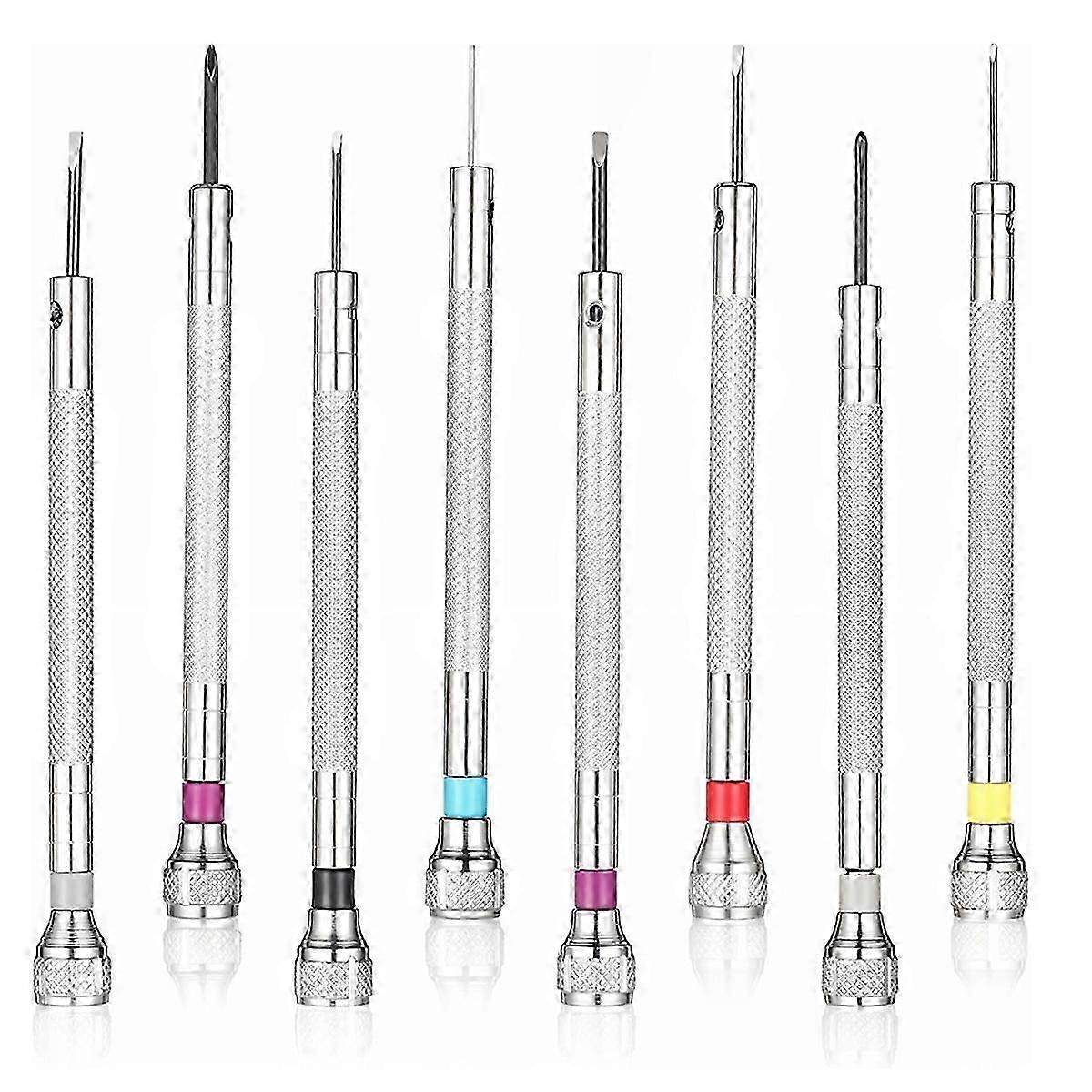 [Complete packaging] This watch screw knife set includes 8 precision screwdrivers: 6 flat -headed screwdrivers (0.6 mm, 0.8 mm, 1.0 mm, 1.2 mm, 1.4 mm, 1.6 mm) and 2 screwdrivers (1.4 mm, 1.6 mm). [High-quality materials] These micro-precision screwdrivers are made of high-quality stainless steel, which are solid, - and .Strong structures that they not break or wear easily, and provide reliable performance to meet all your maintenance needs. [Precision Design] This watch screw knife set is designed for precision work, carefully produced to avoid scratching and damage.The handle design that is in line with ergonomics ensures comfortable grip, allowing you to easily and accurately handle small objects such as watches, glasses and electronic products. [Wide-purpose] This multifunctional screw knife set is suitable for various applications, including watch repair, glasses maintenance, jewelry work and electronic product maintenance.The color-encoded lid can easily and quickly determine the correct size, and save your time and energy during maintenance. [Easy to use] The screwdriver in this set is easy to use.The rotating can achieve smooth operation, and the is clearly printed on the to quickly identify. Compact packaging and light design (85 grams) easy to carry and store. Colour:As Shown Material:Metal Package Contents: 1set * eyeglass screwdriver Only the above package content, other products are not included. Note: Light reflection and different displays may cause the color of the item in the picture a little different from the real thing. The measurement allowed error is +/- 1-3cm.