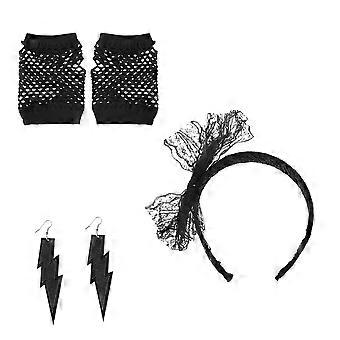 80s Party Fancy Dress Costume with Lace Headband and Neon Earrings for Creative Photo Props Black Cloth