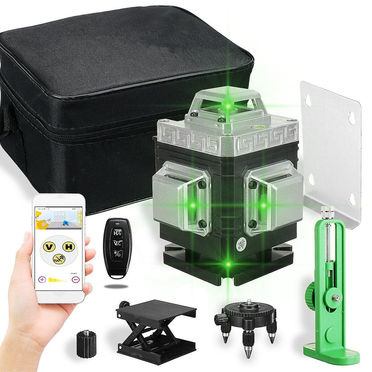 Features:  - Precise measurement and more convenient to use.  - 4D 16 line irradiation, 360° without dead angle.  - Crashworthy and anti knock, 4D soft rubber clad, crashworthy and anti knock.  - ±3°Automatic self leveling function. Sound warning when beyond auto leveling range.  - International standard IP54 waterproof and dust-proof, multiple protection, Longer life in harsh environment.  - Indoor and outdoor general Universal, High brightness green, indoor and outdoor clearly, far projection distance, high laser height, clear lines.  - 4800mAh large capacity battery with longer endurance life, long service life, standby time more than 72 hours, working hours can last 6-10 hours.     Specification:  Remote Type: Infrared remote and APP remote (2 in 1).  Laser Color: Green.  Wall Attachment Distance: 7 mm.  Horizontal/Vertical Accuracy: + 0.2 mm/m.  Wavelength: 505-510nm.  Automatic Leveling Range: 3°±1°.  Protection Level: IP54 Dustproof & Waterproof.  Battery Capacity: 4800 mAh.  Working Environment: Indoor/Outdoor.  Material: Aluminum Alloy Chassis Engineering Plastics.  Plug Specification: EU Plug.  Operating Temperature: -10℃~45℃.  Application: Auxiliary tiles fixing, wall decoration, floor tiles fixing, stair handrails,furred ceiling, floor tile, plastering.     Package Included:  1 x Laser Level.  2 x Lithium Battery.  1 x Remote Control.  1 x Lift Holder.  1 x Wall Bracket.  1 x Iron Sheets.  1 x Bracket Connector.  1 x Charger.  1 x Anti-fall Bag.  1 x User Manual