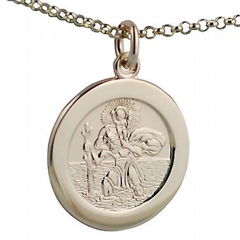 9ct Gold 21mm round St Christopher Pendant with car boat train plane on back with belcher Chain 24 inch