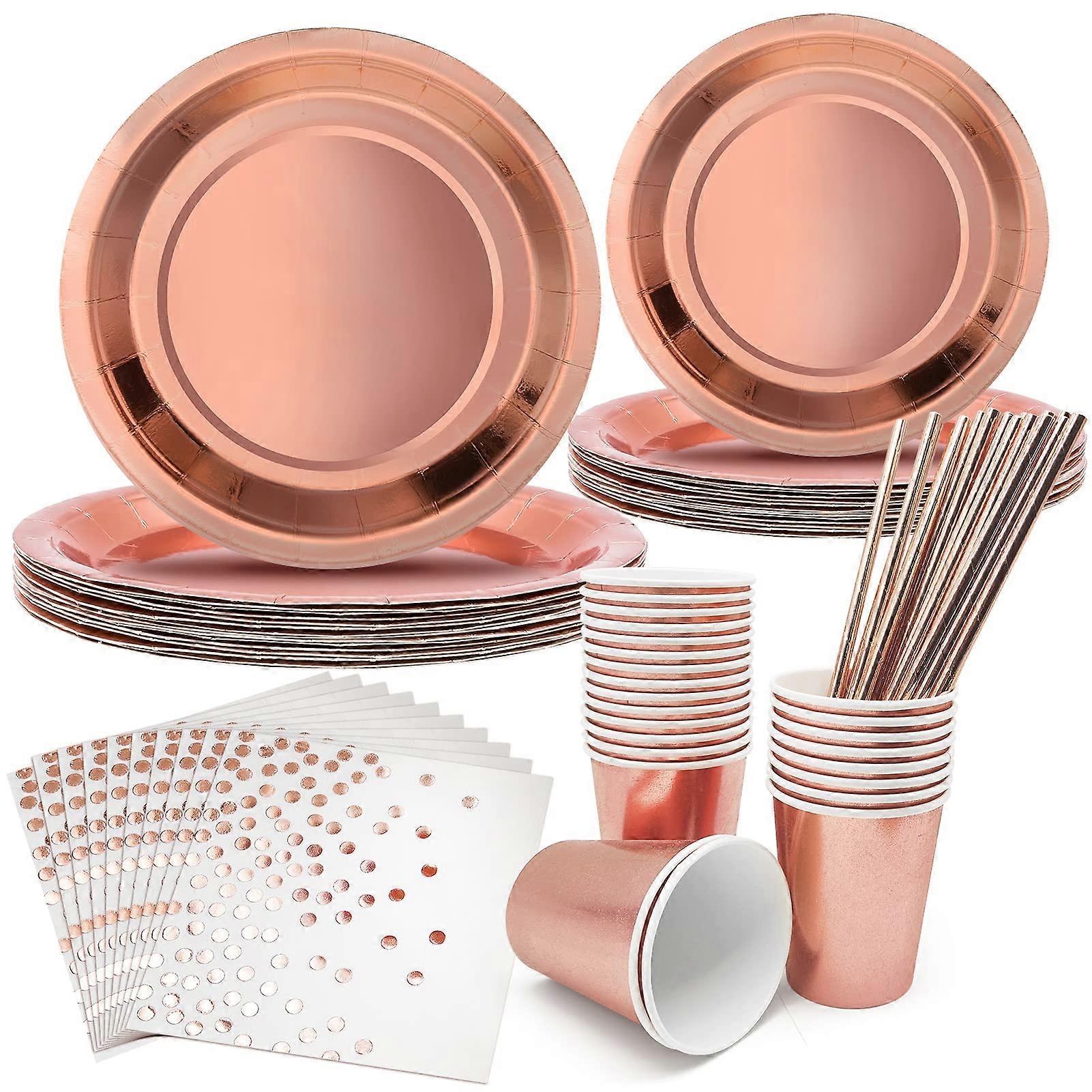 97Pcs Rose Gold Party Tableware, Foil Paper Plates Cups Napkins Straws, Party Supplies Disposable