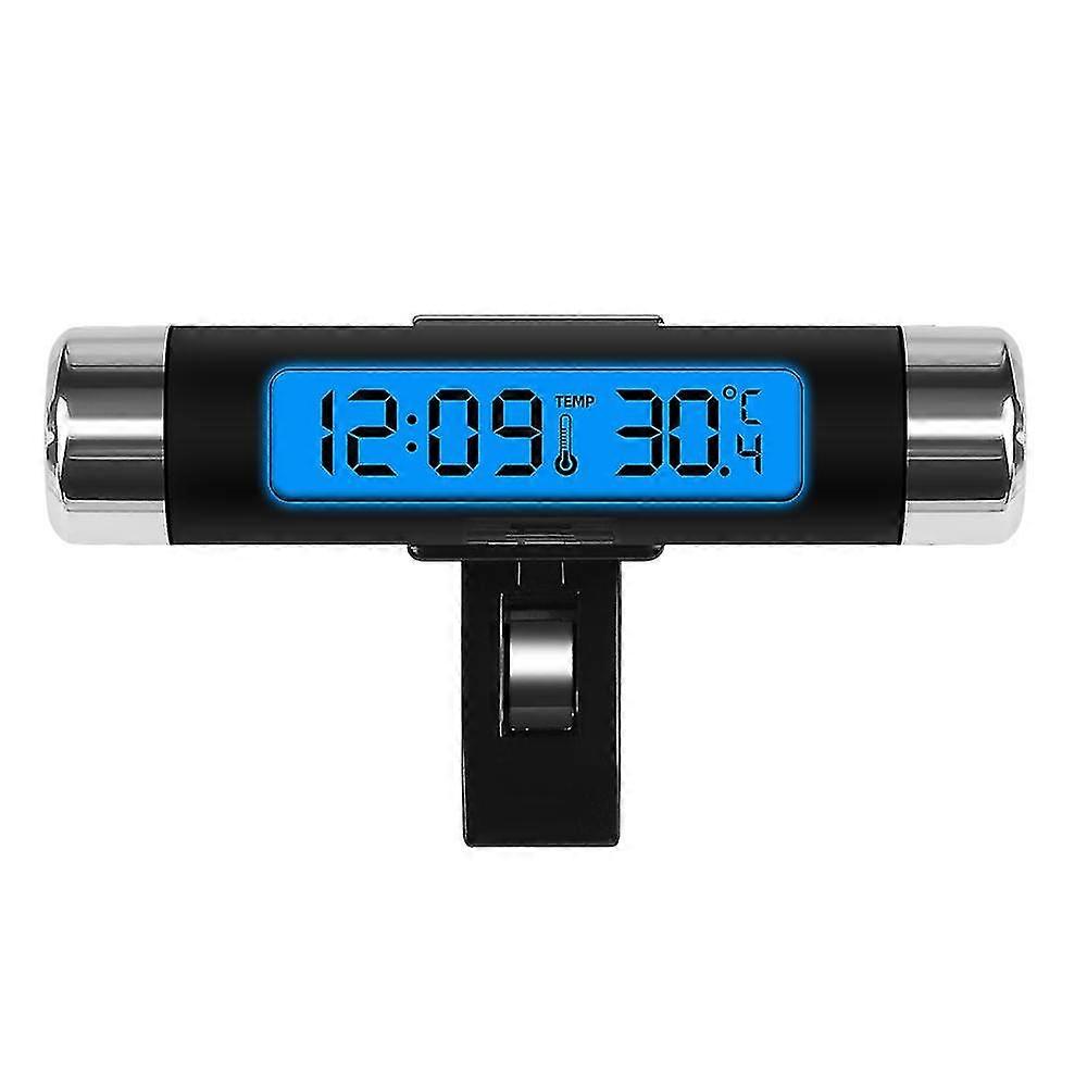 A 2-in-1 Car Watch Thermometer with an air vent clip-on, a luminous clock with an LCD digital display screen and a blue backlight.