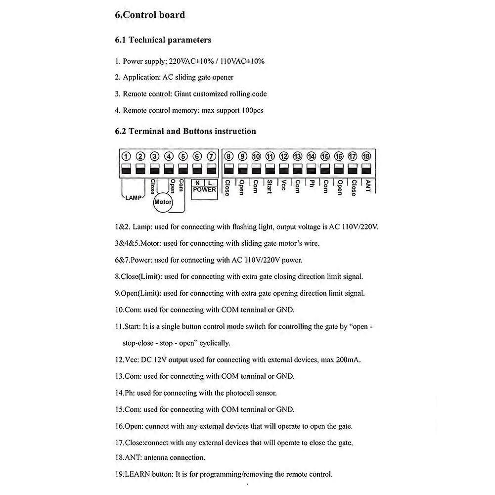Designed specifically for AC sliding gate openers, ensuring optimal performance and reliability. Supports a maximum of 100 remote controls, allowing for easy management and operation of multiple gates. Utilizes a Giant customized rolling code for enhanced security and reduced risk of unauthorized access. Operates on a power supply of 220VAC±10%, making it suitable for various electrical environments. This PCB control board can only use the remote control in our photo, it cannot be used with other remote controls. Color: As Shown Material: PCB Package Contents: 1*Motor Control Board 1*Remote Control