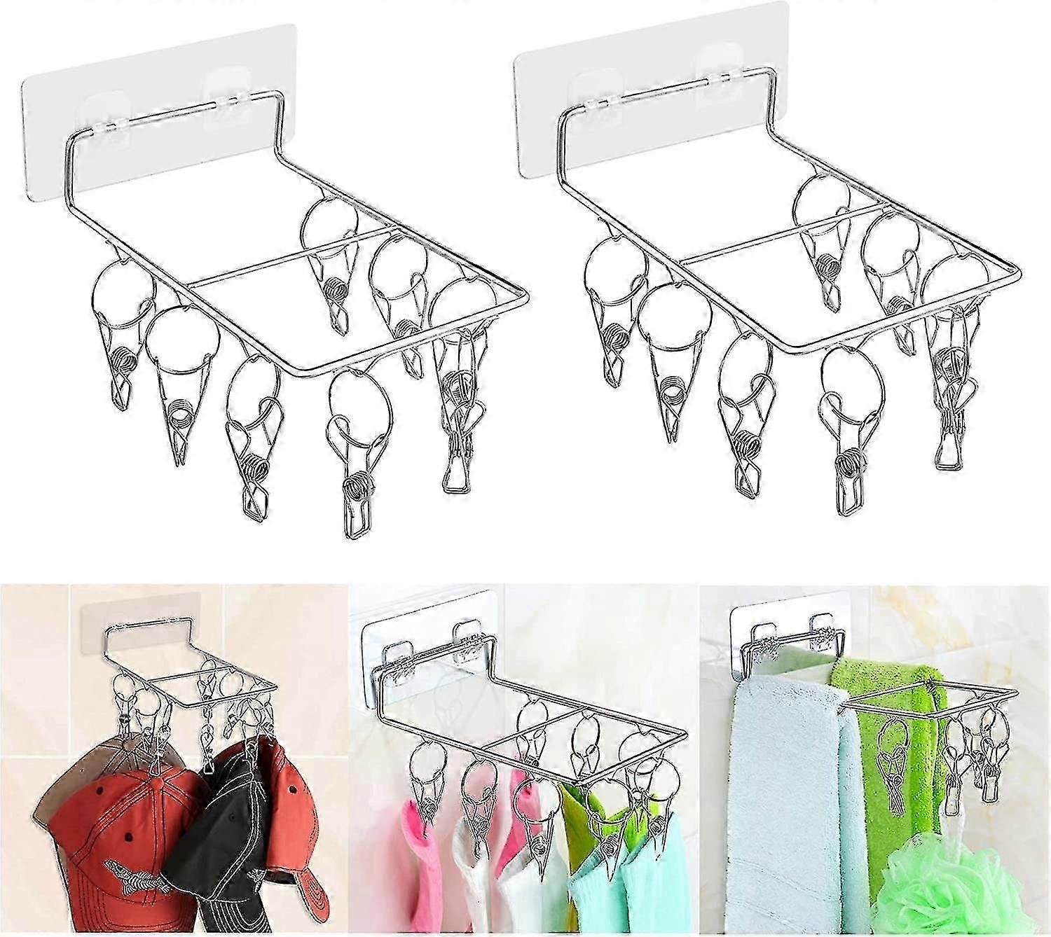 A set of 2 clothes racks hang up to 16 small items totally for multipurpose clothing drying or storage. For indoor use. Setup in a laundry room, bedroom, bathroom, entryway, balcony, etc. The wall hangers with self-adhesive pads are easy to install with no drilling. Adhesive pads are traceless and reusable, will not hurt the wall. Note: Do NOT use on rough walls or painted walls Those hanging racks can be used as a laundry drying rack or Storage Organizer rack for hats, socks, underwear, towel, baby clothing, diaper, scarf, ties, gloves, and other small items. The hanging clothes drying rack are made of stainless steel, 4.2 mm in bold, sturdy, durable, and rust resistant. The hanging pegs are detachable. Hanging drying racks can become hanger organizers to store clothes hangers and hanger clips after removing the pegs. One-piece integrated 5-turn spring design provides more elasticity and grip for the pegs to ensure that clothing is not easy to fall off.