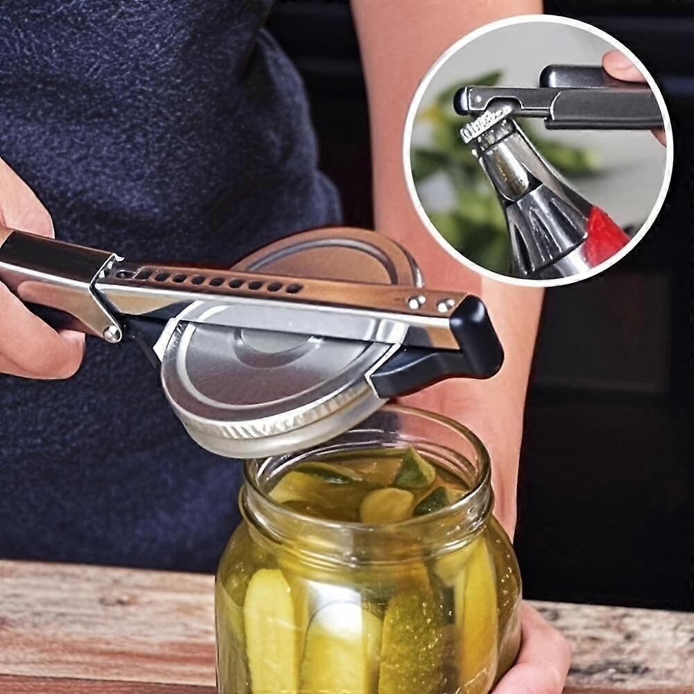 Adjustable stainless steel jar opener with an ergonomic design and soft rubber grip, suitable for all types of canned food lids, making opening easy.