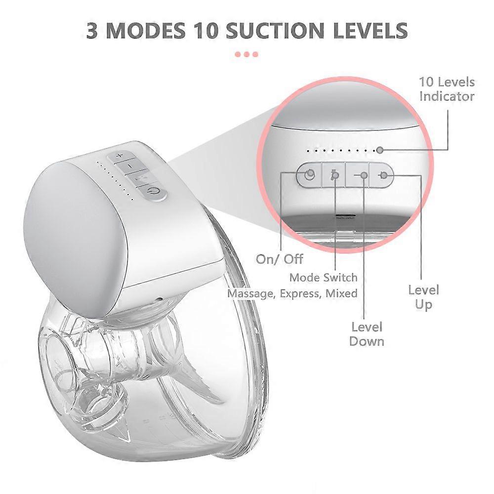 Feature:1. Wearable Breast PumpWearable breast pump, small and lightweight to place inside your bra, hands-free, more convenient to use. No tubes, no cords, no dangling bottles. No more pumping schedule. Pump anywhere anytime as you want to. Baby\u0027s growth requires mom\u0027s presence, and an electric breast pump makes it easier for mom and healthier for baby.2. 3 Modes \u0026 10 Suction LevelsThe wearable breast pump supports 3 modes: Massage Mode/ Express Mode/ Mixed Mode, and each mode has 10 adjustable suction levels. Easy to choose the most comfortable level.3. Built-in Battery \u0026 Low Noise WorkingBuilt in 1000mAh lithium battery, long working time and can be charged by the included USB cable quickly and conveniently. suitable for working, traveling and more. Low noise working, will not disturb your sleeping baby.4. No Pain \u0026 No Leakage24mm flange is suitable for most breast size; made of soft silicone material, which will not cause pain and maintain a good seal. One-way flow, no reverse flow. Anti-reflux design, reduce pollution.5. Easy to Assemble and UseEasy to assemble, and the components can be cleaned and disinfected in boiled water or steam except the motor. Comes with bra adjustment buckle and breastmilk storage bags for more convenient usage.Specification:The invisible breast pump is small and lightweight to place inside your bra. Hands-free, more enjoyable and discreet way to express breastmilk.Features:Wearable Breast PumpWearable breast pump, small and lightweight to place inside your bra, hands-free, more convenient to use. No tubes, no cords, no dangling bottles. No more pumping schedule. Pump anywhere anytime as you want to. Baby's growth requires mom's presence, and an electric breast pump makes it easier for mom and healthier for baby.3 Modes & 10 Suction LevelsThe wearable breast pump supports 3 modes: Massage Mode/ Express Mode/ Mixed Mode, and each mode has 10 adjustable suction levels. Easy to choose the most comfortable level.Built-in Battery & Low Noise WorkingBuilt in 1000mAh lithium battery, long working time and can be charged by the included USB cable quickly and conveniently. suitable for working, traveling and more. Low noise working, will not disturb your sleeping baby.No Pain & No Leakage24mm flange is suitable for most breast size; made of soft silicone material, which will not cause pain and maintain a good seal. One-way flow, no reverse flow. Anti-reflux design, reduce pollution.Easy to Assemble and UseEasy to assemble, and the components can be cleaned and disinfected in boiled water or steam except the motor. Comes with bra adjustment buckle and breastmilk storage bags for more convenient usage.Specifications:Quantity: 1 Pack/ 2 Pack (Optional)Color: Pink/ Grey(optional)Material: Silicone + ABS + PPInput: 5V 1AMode: Massage (Red Light), Express (Blue Light), Mixed (Purple Light)Adjustable Level: 10 Levels Each ModeBattery Indicator: Green (31%-100%), Orange (11%-30%), Red (1%-10%)Battery Capacity: 3.7V 1100mAh Lithium BatteryCup Capacity: 240ml / 8ozCup Diameter: 11.5cm / 4.5inMotor Size: 8 * 6 * 6.5cm / 3.1 * 2.4 * 2.2inItem Weight: 262g / 9.2ozPacking List:2 * Pump Motor2 * 240ml/8oz Cup2 * 24mm Silicone Breast Cover2 * Membrane2 * Valve Base4 * Duckbill Valve2 * Dust Cover2 * USB Cable (Type-C)2 * Storage Bag2 * User Manual (English)2 * Bra Adjustment Buckles10 * Breastmilk Storage BagsPackage List:2 * Pump Motor2 * 240ml/8oz Cup2 * 24mm Silicone Breast Cover2 * Membrane2 * Valve Base4 * Duckbill Valve2 * Dust Cover2 * USB Cable (Type-C)2 * Storage Bag2 * User Manual (English)2 * Bra Adjustment Buckles10 * Breastmilk Storage Bags