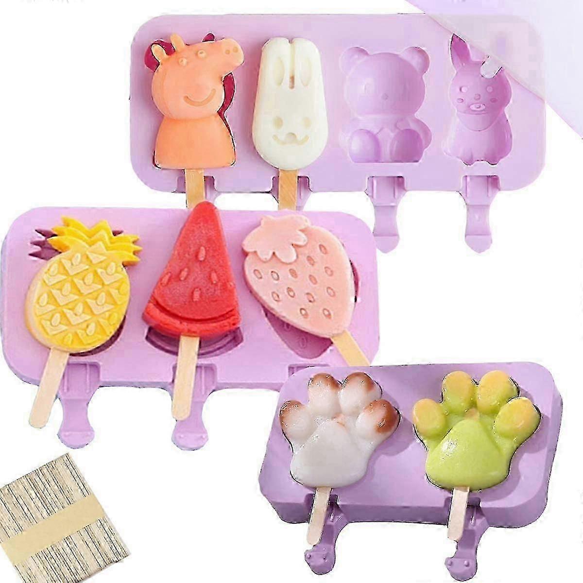 3pcs different purple ice cream silicone mold with 150 ice cream sticks. Includes 2 cat paws, 3 fruits and 4 small animals, each silicone mold is covered. The ice cream made is very cute, not too big, and can be eaten by adults and children. Made of food grade silicone, BPA free, odorless when placed in the refrigerator with a lid, you can use it with confidence. You can create a unique popsicle by yourself in the hot summer, which is delicious and very satisfying.