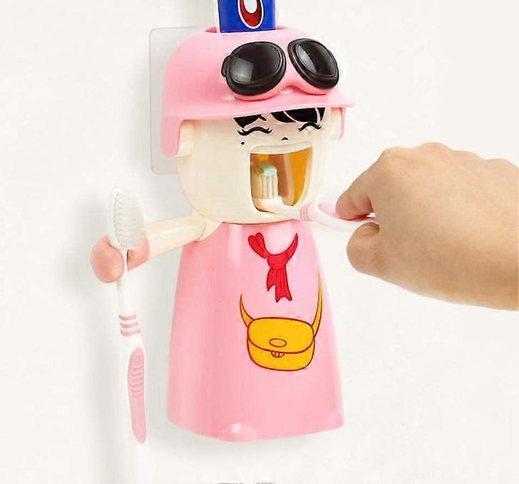 Cartoon toothpaste squeezer. Children's automatic hands-free toothpaste dispenser with toothpaste box. Pink