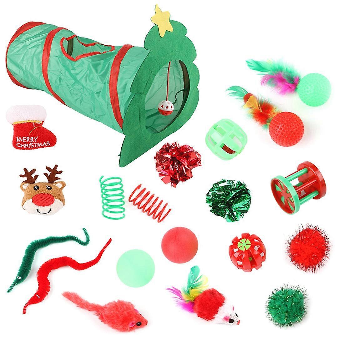 Chrismas Cat Toys Kitten Tunnel Set Variety Catnip Toys with Green Tunnel Stimulating Cats' Natural Instincts Xmas Gift
