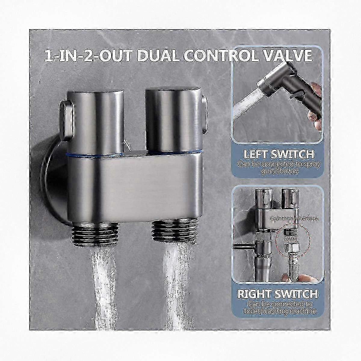 New Design: Holds 2 shower heads for a versatile shower experience. The black surface is stylish and easy to clean. Handheld Bidet Sprayer: Made of high-quality 304 stainless steel and brass, rustproof and durable. Ergonomic design for comfort and efficiency. Easy Installation: Quick setup in under 10 minutes with minimal tools. Enhances hygiene with a clean, soothing wash. Premium Durability: Features a 1-in-2-out dual control valve for long-lasting performance in various settings. Wide Applications: Suitable for baby cloth cleaning, pet showers, flower watering, toilet cleaning, and more. Product Details: - Dual faucet with G1 or 2 inch (20mm) male thread - Brass spool and casting, electroplated and polished - Compact design for homes, offices, or hotels - Simple installation, no tools required - Silver color, copper-alloy construction Package Includes: 1 x Angle Valve Note: Slight color variations may occur due to lighting or display settings. Measurement tolerance: 1-3cm.