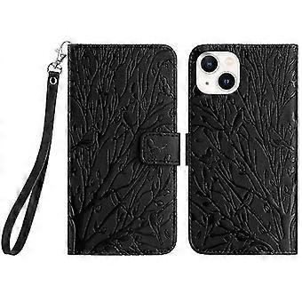 Compatible with Iphone 15 Tree Birds Embossed Pattern Leather Mobile Phone Case