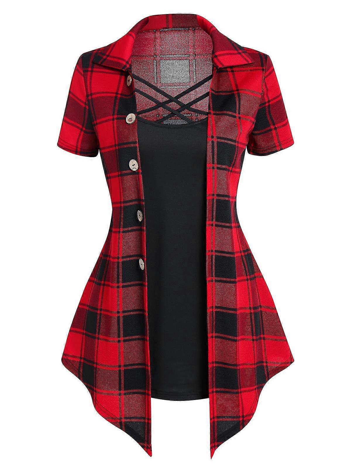 Crisscross Plaid Print Mock Button Casual Faux Twinset T Shirt Combo Women 2 In 1 Tee Twofer Summer High Waist Fashion T-shirts