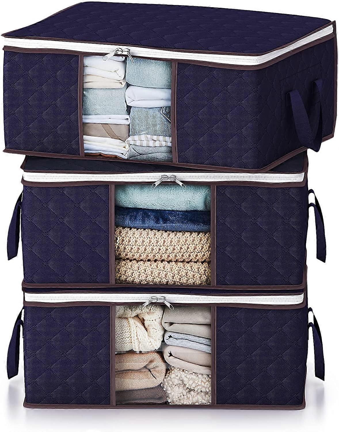 Dark Blue Large Capacity Clothes Storage Bag Organizer with Reinforced Handle Thick Fabric for Comforters, Blankets, Bedding, Foldable with Sturdy Zi