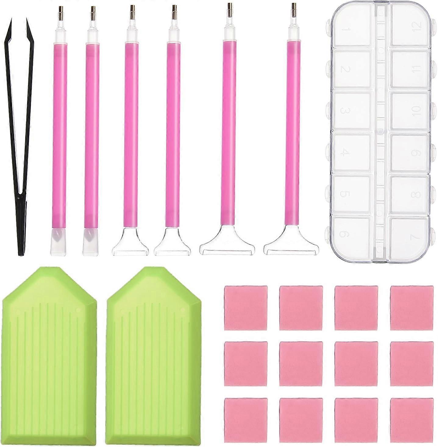Abundant and various tools: 6 pieces of diamond sticky pen in 3 different types, 12 pack of glue, 2 plastic plates and 1 piece of tweezers, 1 diamond embroidery box, 22 pieces in total Diamond sticky pen: for the same color in a large area of diamonds sticky work, the 3/ 6/ 9 diamonds sticky pen is a convenient toll, you can stick 3 pieces, 6 or 9 pieces diamonds at the same time How to use: put the diamonds you needed into the plastic plate, gently shake to make the diamonds arranged in a row; Apply clay on the sticky pen, then use the pen to stick the diamond and paste it in the place where you want Tools measurement: diamond stitch pen's length about 12.5 cm/ 4.9 inch; Plastic tray size (L x W): 9 x 5.5 cm/ 3.5 x 2.2 inch; Tweezers length: 12 cm/ 4.7 inch Diamond embroidery box: multi-functional design, about 13 x 5 x 1.6 cm with 12 compartments, you can use it to storage your painting diamond or other little items you like,Please excuse the color difference.