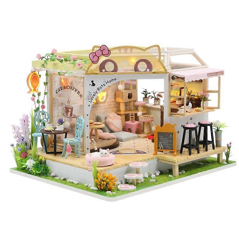 DIY creative assembly doll house leisure cat cafe small house wooden house with light puzzle game