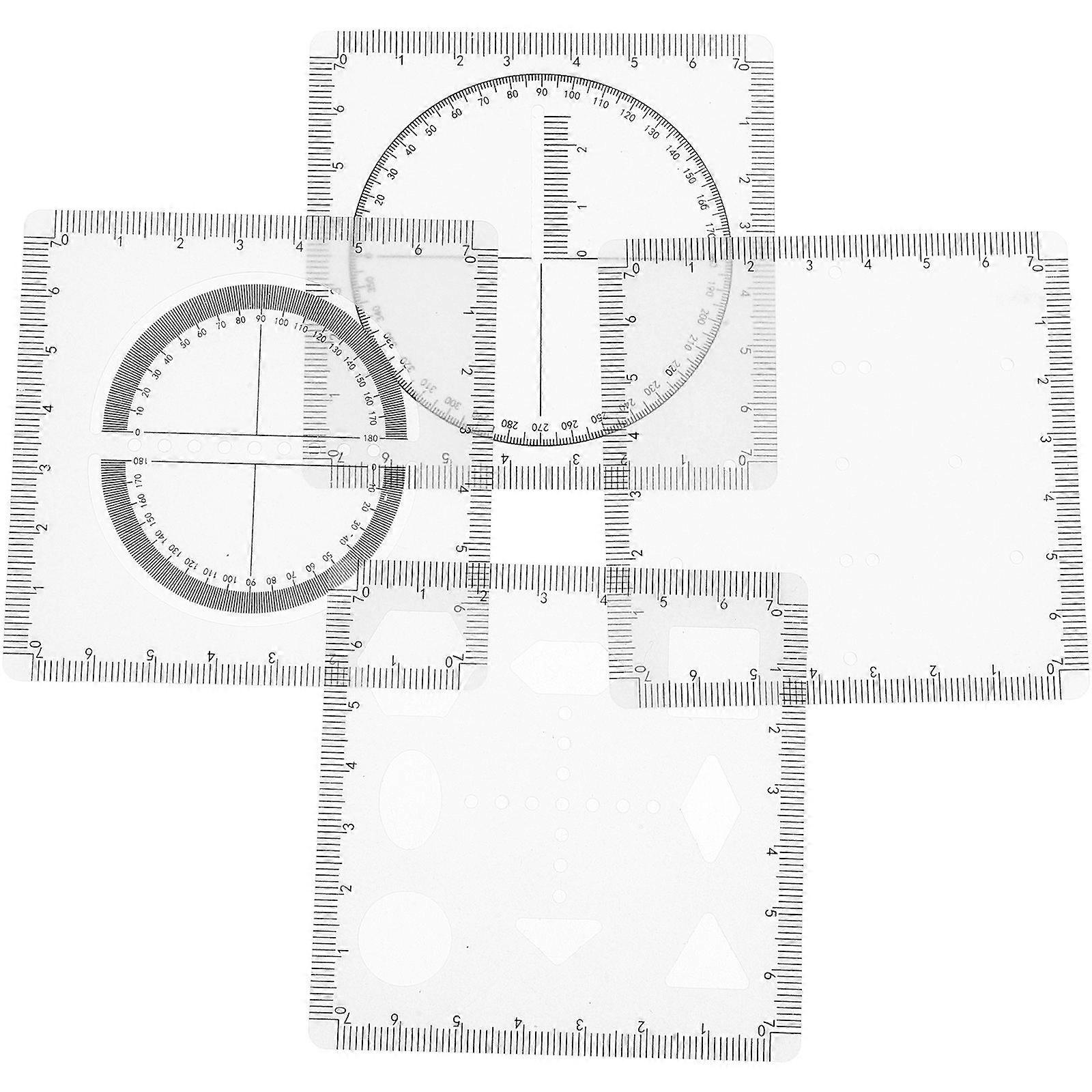 Our multifunctional geometric ruler set is a tool for students who need to create accurate geometric drawings. The set includes a primary geometric ruler, an edge and corner drawing ruler, a point ruler, and a multifunctional geometric ruler. These tools are designed to replace traditional drawing instruments, making them essential for any math or art project. Features -Color:Transparent -Material:Plastic -Size:8.00X8.00X0.10cm/3.14X3.14X0.04in -This comprehensive set includes a primary geometric ruler, an angle drawing ruler, a point ruler, and a multifunctional geometric ruler, ensuring all your drawing and measurement needs are met. -The set allows for precise ruler and compass drawings, accurate angle measurements, and the creation of various 3d geometric shapes, making it an essential tool for students. -Engineered for durability, this set is designed to withstand extended academic sessions, providing use and reliability for students. -Compact and easy to carry, this set fits into various scenarios, making it convenient for students to bring along to classes, study sessions, or fieldwork. -Providing precise geometric drawing and measurement, this set ensures students can achieve accurate and detailed results in their mathematical and geometric tasks. Package list: 1 Set x Geometric Drawing Tools