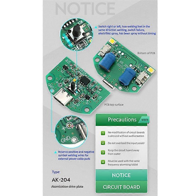 Name: Atomization drive circuit board Rated voltage: DC 5V Rated current: 300mA Power: 2-3W Resonant frequency: 108-110KHz Precautions: Do not modify the circuit board without permission Do not overload input power The circuit board should not be exposed to water and damp Must be used together with the same frequency atomizing tablet Colour:green+white Material:PCB+plastic+metal Size:33.9 x 22.6 x 17mm Package Contents: 1 x atomization module 2 x Nebulizer 2 x cotton swabs 2 x holders Only the above package content, other products are not included. Note: Light reflection and different displays may cause the color of the item in the picture a little different from the real thing. The measurement allowed error is +/- 1-3cm.