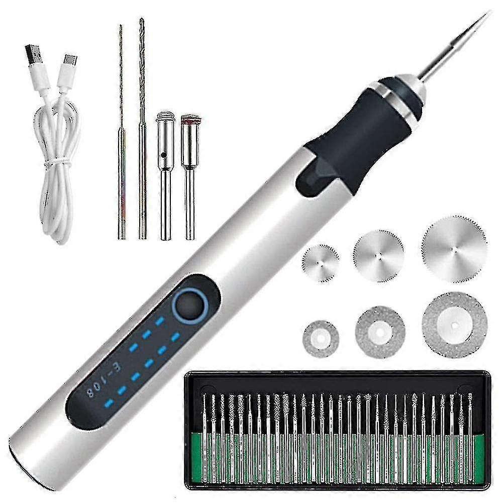 Cordless electric engraving pen, mini nail art set, hand-carved wood carving kit with complete accessories.USB charging, quiet operation. Powered by 300mAh lithium battery, 3 speed options, the body is made of alloy material, which has good heat dissipation, making your artistic DIY creation easy.The jewelry etching tool has smart overload protection, so you dont have to worry about engine damage. Small and portable, the whole machine weighs only 40g.The mini engraving machine has a built-in power switch design, so there is no need to worry about accidentally touching the switch and stopping the operation.Versatile Precise Control: Can be used to engrave, sharpen, grind or polish wood, plastic, tile, glass, ceramic, stone, metal and more.Colour: SilverMaterial: MetalPackage Contents:1 * Engraving Pen1 * Data Cable1 * T-Shape Grinding Head2 * 2.35 Shank Bar30 * 2.35 Rotary Drill2 * Drill Bit (1.0mm, 1.5mm)3 * Sanding Discs (16mm, 20mm, 25mm)3 * Stainless Steel Cutting Discs (22mm, 25mm, 32mm)Only the above package content, other products are not included.Note: Light shooting and different displays may cause the color of the item in the picture a little different from the real thing. The measurement allowed error is +/- 1-3cm.