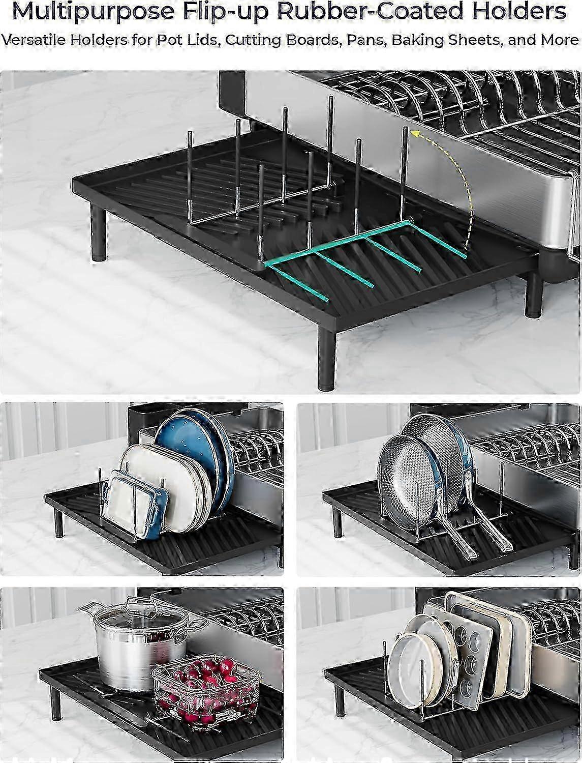 1. Large Dish Drying Rack, Expandable Dish Racks for Kitchen Counter, Space Saving 304 Stainless Steel Kitchen Dish Drying Rack, Extra Large Dish Drainer with Multifunctional Flip Up Pegs, Black Note: Due to the light and screen setting difference, the item's color may be slightly different from the pictures. Please allow slight dimension difference due to different manual measurement.