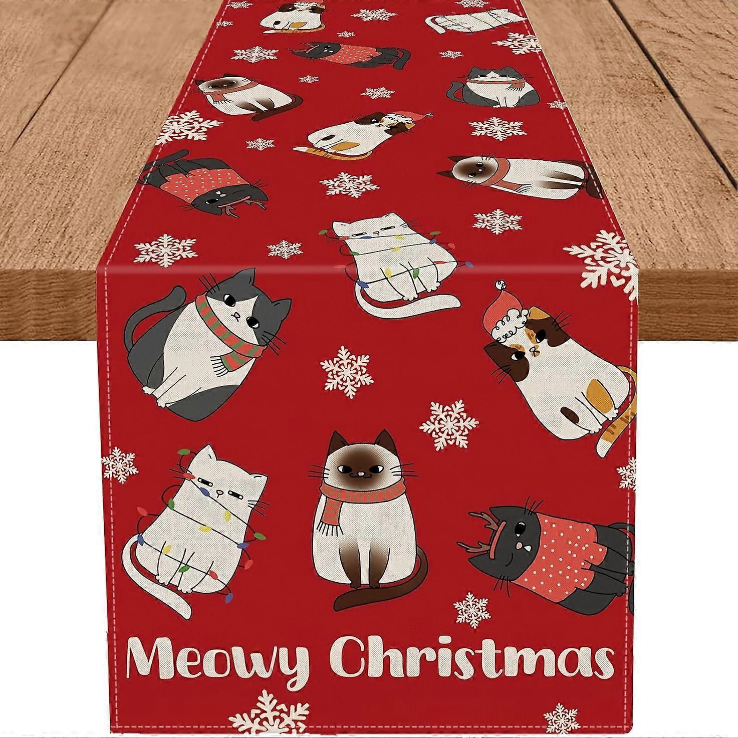Festive Christmas Table Runner Polyester Construction With Cat Snowflake And Meowy Christmas Patterns For Dining Room Table