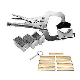 Handheld Fret ,Pressing in frets is the most consistent way to get every fret seated along its whole length. The Handheld Fret is a professional fretting tool that gives you finer control over the pressure needed to seat a fret into the slot, you can actually feel it seating! It eliminates complicated clamping setups, so your -in fret jobs go faster. There's a self-levelling upper caul that adjusts easily to any neck and it fits any of 9 interchangeable brass inserts , The neck support that on bottom can slide back and forth. This is a steel tool that's easily adjustable. It has a fine thumbwheel adjustment for clamping pressure. A clamp release lever unlocks the tool. The jaws open enough to accommodate any instrument neck. The sliding neck support has protection pad on it, different supports can be quick changed by using the quick release pin. 7.25/9.5/10/12/14/15/16/17/20 radius brass inserts, each is marked with number clearly, easy and convenient to use. Color: Silver Material: Metal Package Contents: 1 x Fret Caul Tool kit 9 x Radius inserts Only the above package content, other products are not included. Note: Light reflection and different displays may cause the color of the item in the picture a little different from the real thing. The measurement allowed error is +/- 1-3cm.